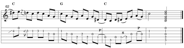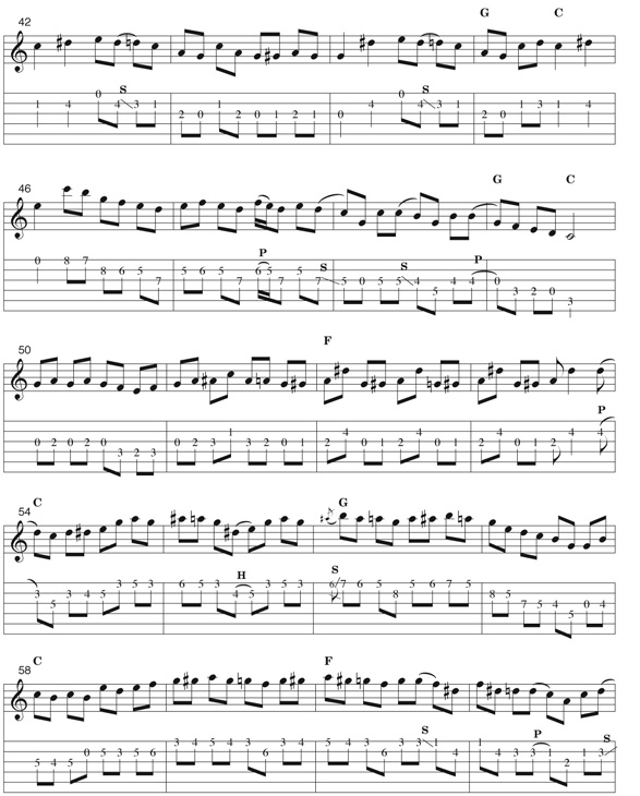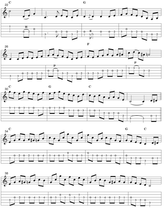 When picking the melody you will find your left hand switching from third position to first position quite a bit. If there is an open string, then you can shift positions while the string is ringing. Otherwise, you must take extra care of the slides, for that is how you will move between positions smoothly. I do not like to stifle guitarists with too many fingerings, but you must slide with a finger that will allow yourself to grab the next note with an available finger!